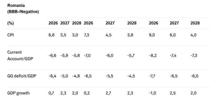 În scenariul de bază al S&P, în care cotaţia barilului de petrol Brent va fi în medie de 80 dolari în 2026 şi va scădea la 65 dolari în 2027, România ar avea o rată a inflaţiei de 7,3% în 2026, 4,5% în 2027 şi 3,8% în 2028. Deficitul de cont curent ca procent din PIB ar urma să se situeze la 7% în 2026, 6% în 2026 şi 5,7% în 2028, în timp ce deficitul bugetar ca procent din PIB era prognozat la 6,5% în 2026, 5,5% în 2026 şi 4,5% în 2028. Creşterea economiei urma să se situeze la 0,2% anul acesta, 2,7% anul viitor şi 2,3% în 2028.