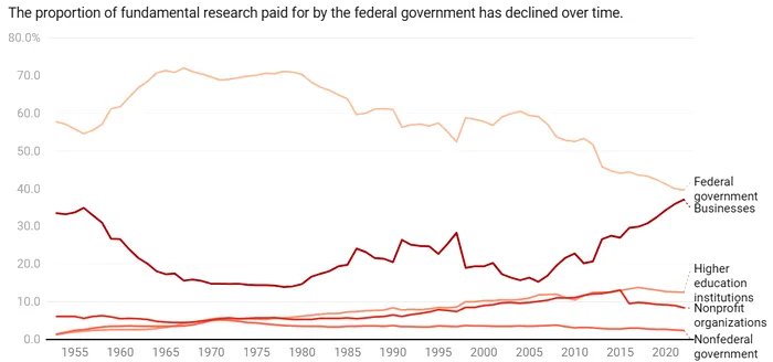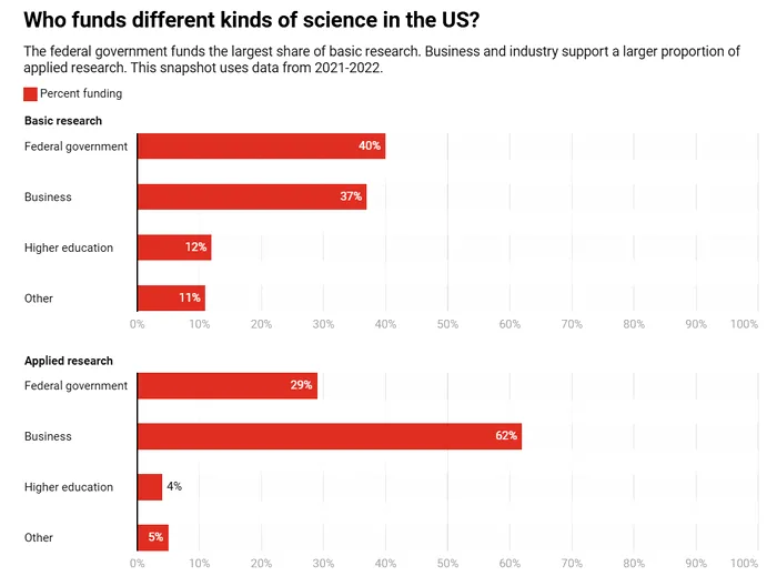 În același timp, investițiile private urmăresc profitul. Asta înseamnă că cercetările cu aplicabilitate imediată – de la gadgeturi la medicamente – atrag cei mai mulți bani. Domeniile fără beneficii comerciale clare depind, în schimb, aproape exclusiv de sprijin guvernamental.