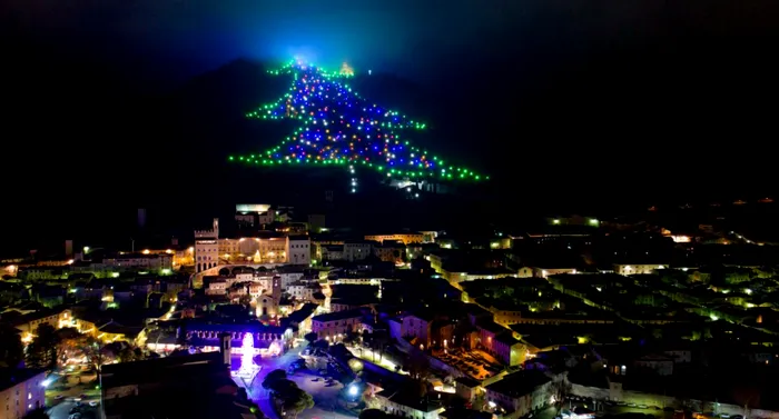 Gubbio oferă o instalație unică. Nu este un brad în sens clasic, ci o compoziție uriașă de lumini așezate pe versantul Muntelui Ingino. Instalația a fost inaugurată în 1981, iar dimensiunile ei sunt impresionante: iluminarea poate fi observată de la kilometri depărtare.
