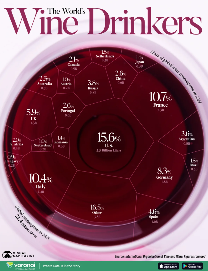 Consumul mondial de vin a ajuns în 2024 la aproximativ 21,5 miliarde de litri. Primele cinci țări consumatoare – Statele Unite, Franța, Italia, Germania și Marea Britanie – însumează peste 50% din totalul global, potrivit unei analize Visual Capitalist bazate pe datele Organizației Internaționale a Viei și Vinului (OIV).