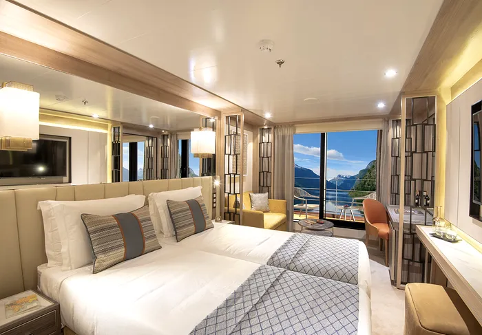 Toate cabinele au balcon privat și vedere directă la ocean, iar interiorul combină stilul scandinav minimalist cu dotări de ultimă generație.