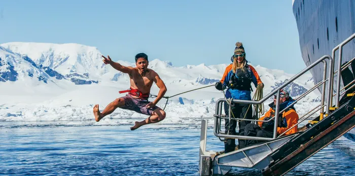sau pentru cei mai „curajoși”, faimoasa scufundare polară („Polar Plunge”) – o provocare rezervată celor care vor să simtă cu adevărat frigul din apele Antarcticii