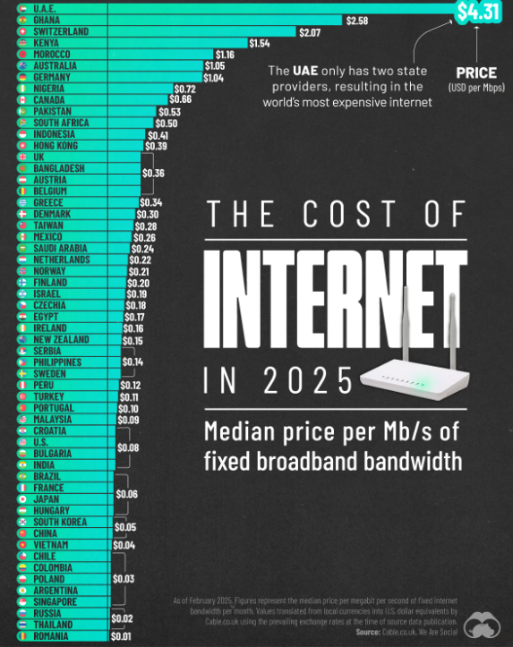 Un raport publicat de platforma Visual Capitalist arată că România este țara cu cel mai mic cost pe megabit pe secundă (Mbps) transferat pe internet.