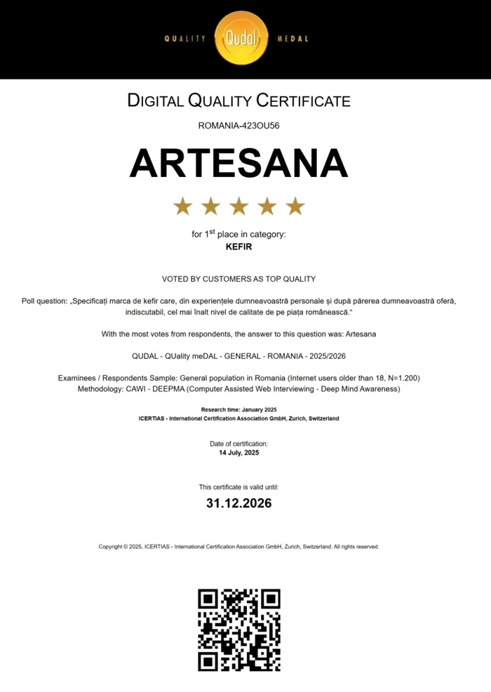 Rezultatul? Medalia QUDAL – Quality Medal 2025/2026, acordată pentru kefirurile Artesana.