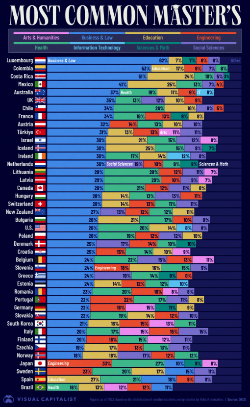 Un raport recent realizat de Visual Capitalist, pe baza datelor publicate de OCDE, confirmă că Business și Drept sunt domeniile care atrag cei mai mulți studenți la nivel de masterat. Atât în România, cât și în alte 43 de țări membre și partenere ale OCDE.