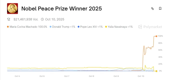 Publicațiile norvegiene Aftenposten și Finansavisen au analizat datele care arată o creștere neobișnuită a pariurilor pe numele Mariei Corina Machado, lidera opoziției din Venezuela. Platforma Polymarket, unde s-a produs fenomenul, este cunoscută pentru predicțiile sale legate de evenimente politice. La miezul nopții, șansele lui Machado de a câștiga Premiul Nobel pentru Pace erau de doar 3,75%, fiind depășită de Yulia Navalnaya, văduva lui Alexei Navalnîi, și de Donald Trump. În total, volumul pariurilor pentru câștigătorul Nobelului pentru Pace s-au ridicat la peste 21,5 milioane dolari. Președintele Donald Trump a atras pariuri în valoare de aproape 14 milioane dolari, în timp ce „miza” alocată Mariei Corina Machado a fost de doar 2,2 milioane dolari.