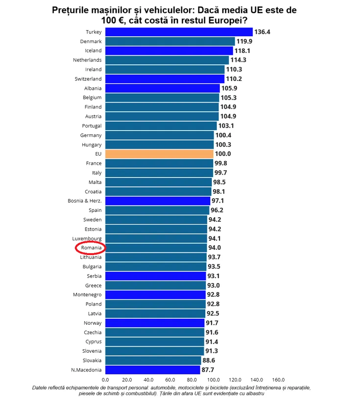 Analiza realizată la nivelul a 36 de state europene indică faptul că Turcia este cea mai scumpă țară pentru vehicule personale. Prețurile sunt aici cu 36,4% peste media UE. Asta înseamnă că un vehicul care costă 100 de euro în medie europeană ar ajunge să coste 136,4 euro în Turcia. Totuși, valoarea indicelui a scăzut ușor față de 2021, când era de 147,10 euro.