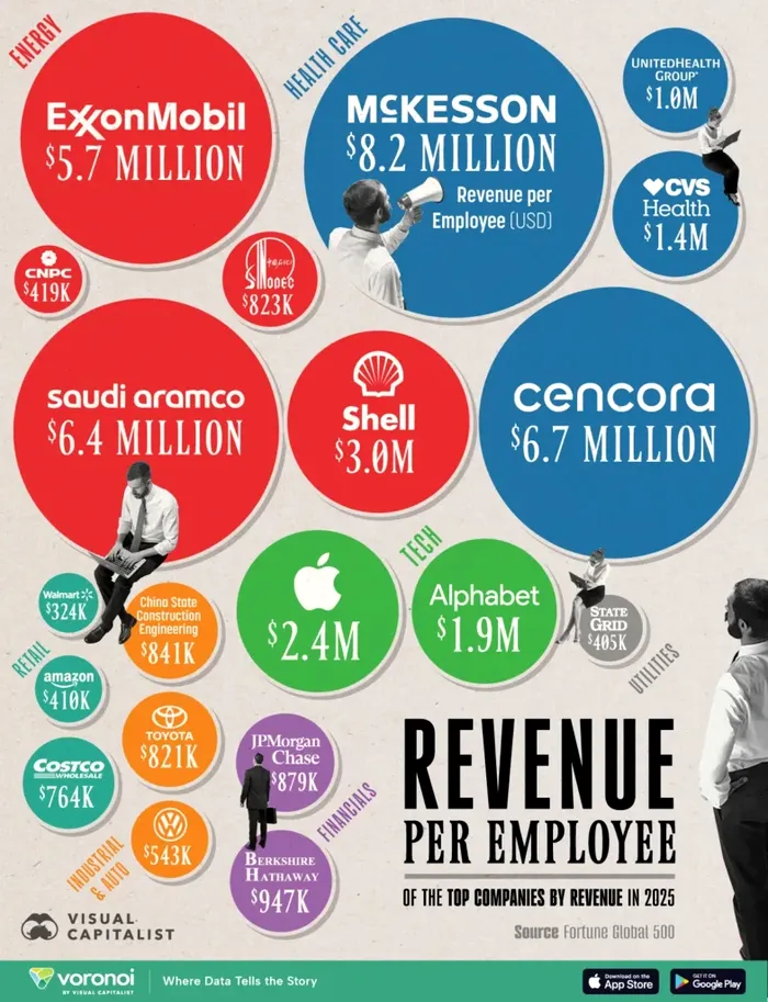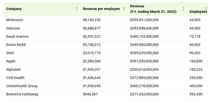 Saudi Aramco produce 6,39 milioane dolari per angajat, iar Exxon Mobil 5,74 milioane dolari. Shell obține 3,01 milioane dolari ca venituri per angajat. În sectorul tehnologic, Apple generează 2,38 milioane dolari per angajat, iar Alphabet 1,91 milioane dolari.